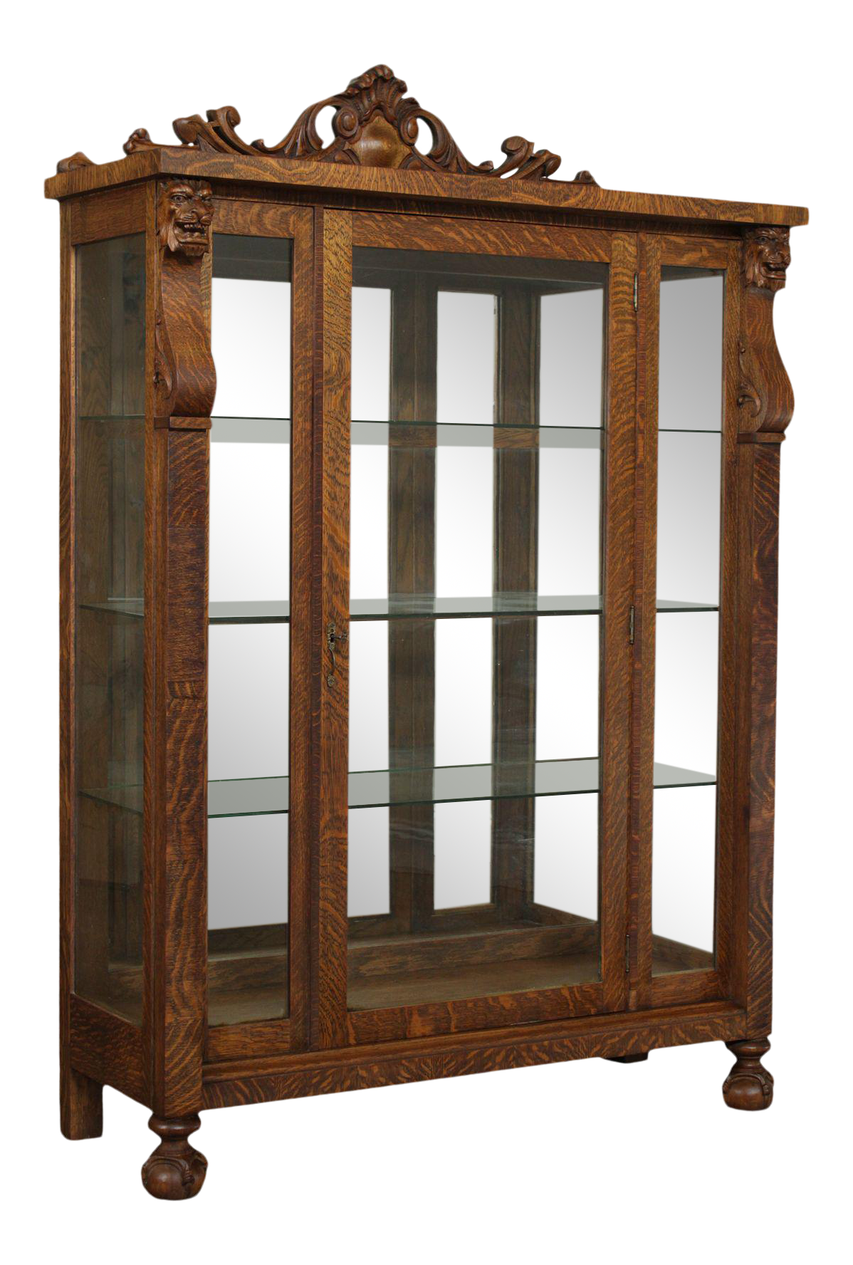 Antique Quartersawn Oak Leaded Beveled Curved Glass Lionhead China Cabinet Claws Antique Furniture Antique Oak Furniture Victorian Furniture